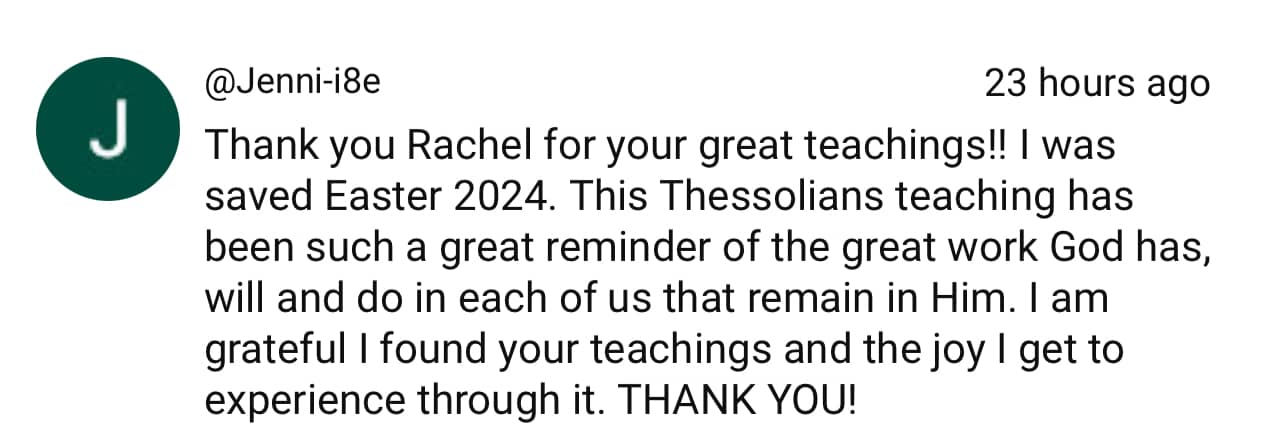 Hey Reader, I hope you’re stepping into this week with a desire to continue growing and being rooted in God’s Word as we move forward in our Thessalonians study. If you missed last week’s teaching, we spent time in 1 Thessalonians Chapter 2, looking at the heart posture behind how we live, serve, and share the gospel. If you haven’t had a chance to watch yet, you can catch up here before we continue the challenge tomorrow. As a quick reminder, the teachings go live on YouTube every Tuesday at 7 am EST through May 5th. You can also use the calendar button below to set a reminder so you don’t miss it. This past week, as we walked through Chapter 2, it’s been so encouraging to see how many of you are being blessed by the study. Hearing how the Word is meeting you and shaping your perspective has been such a gift to witness. Take a moment to look below and see what some of your peers have been sharing about the study. 1 Thessalonians Chapter 2: